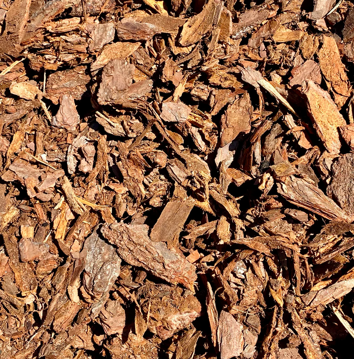 Nugget-sized pieces of pine bark, approximately 2-1/2 inches in diameter and brownish in color. This mulch is good for acid-loving plants, trees and bushes.